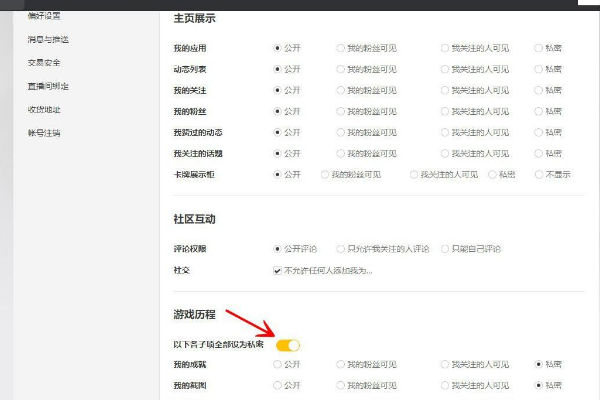 3、把「游戏历程」下面的「以下各子项全部设为私密」启用即可,如下图所示: