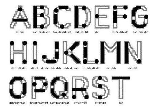 摩尔斯电码是一种早期的数字化通信形式,但是它不同于现代只使用零和一两种状态的二进制代码,它的代码包括五种: 点、划、点和划之间的停顿、每个字符之间短的停顿、每个词之间中等的停顿以及句子之间长的停顿。