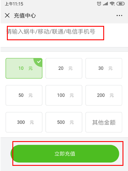 6、输入手机号码,选择重置金额,点击【立即充值】。