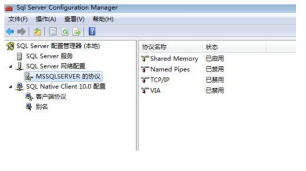 4,在左边的单机栏中找到MSSQLSERVER的协议,然后点击选取,然后在这个右边的空白处就会跳出协议名称和各自的状态,这个时候我们发现TCP/IP的状态是禁用的。