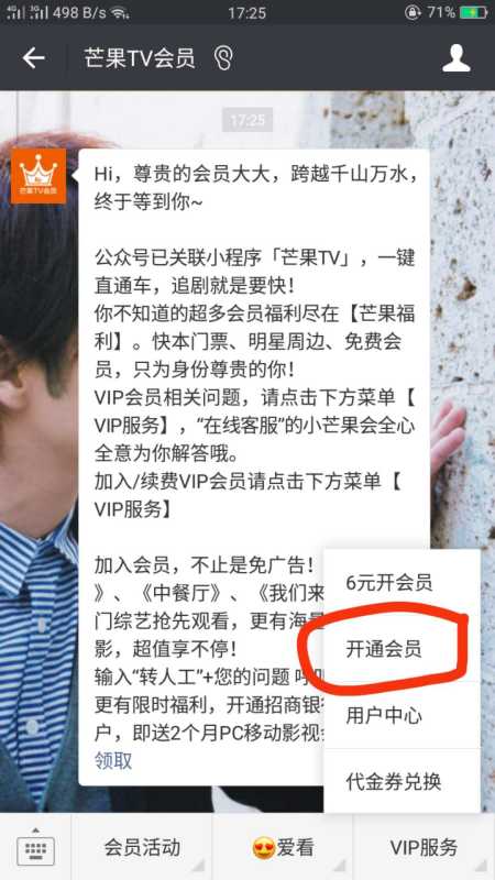 搜索“芒果TV会员”公众号,关注之后,右下角VIP服务,点击“开通会员”。