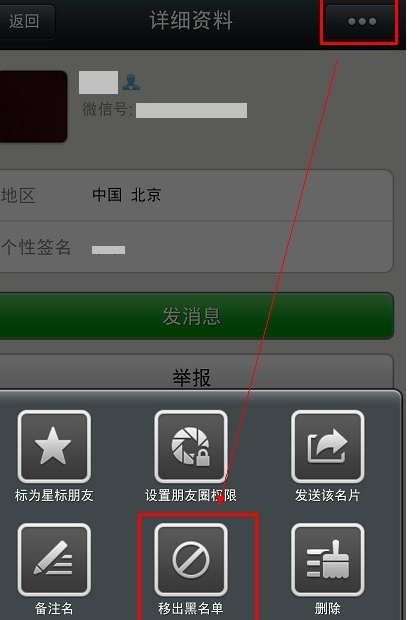 7、在【详细资料】界面点击界面右上角“●●●”三点图标按钮。接下来就会在界面底部显示选项面板,点击里面的【移除黑名单】按钮;