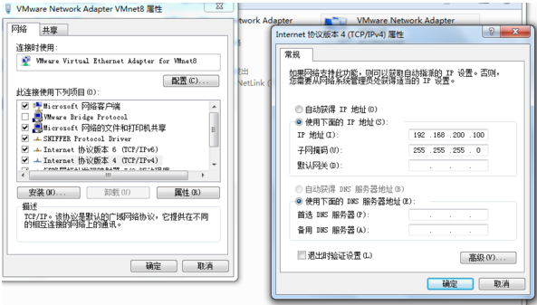 你这个理解错了,,这个虚拟网络编辑器是给你添加网卡的,你添加vmnet8就是在你真实的电脑上添加了一个虚拟的网卡,这个地址是这个网卡处于的“网段”,切记,是网段!而不是IP地址,因为根本不存在192.168.200.100这个网段,所以会报错。 更改方法 网段还是要设置成192.168.200.0,255.255.255.0,确定 然后进入网络连接设置里面,找到这个虚拟网卡 点进去,修改IPV4地址为你需要的 然后再在虚拟机上面使用这个网卡就可以了vmet8 设置重出现出错.子网IP和子网掩码不匹配