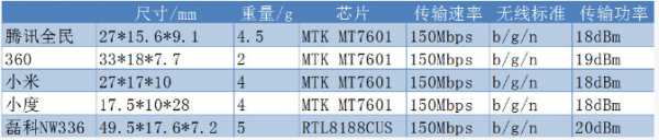 可以横直观的看出,除了磊科NW336的体型稍大之外,它们体长都差不多,重量都在5g以下,非常便于携带。传输功率方面,磊科和360较高,分别是20和19dBm,其余随身wifi都是18dBm,但分别不大。这种功率级别可以应对室内10来米传输距离,穿1、2堵墙的需求。