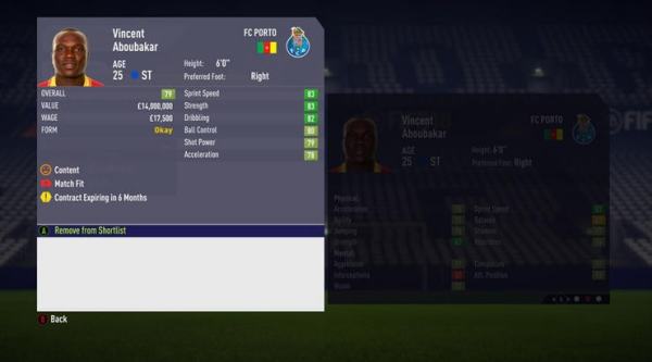 玩家们需要知晓的信息:如果你正在寻找一个比较廉价的攻击球员,那么喀麦隆国脚阿布巴卡尔是一个再好不过的选择了。这名高效率的波尔图前锋有实力让自己的总体评分来到82,而且他的力量和速度也是非常优秀的,此外阿布巴卡尔的花式技巧可是五星级。尽管阿布巴卡尔可能对薪水有一些要求,但是玩家们在他目前的薪水基础上(阿布巴卡尔目前的工资是17500英镑)增加一点应该就可以满足这位喀麦隆前锋了。