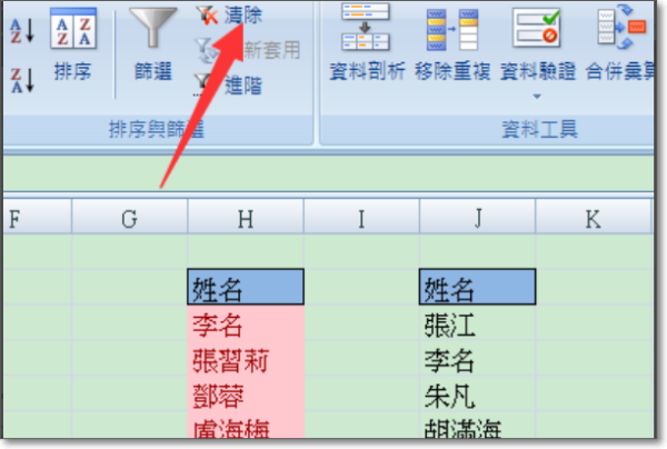 6、将H列筛选出来的姓名以颜色标注,标注完成后点击【筛选】—【清除】,此时就可以看到完整的H列了,有颜色的为重复姓名,无颜色的为不同姓名。