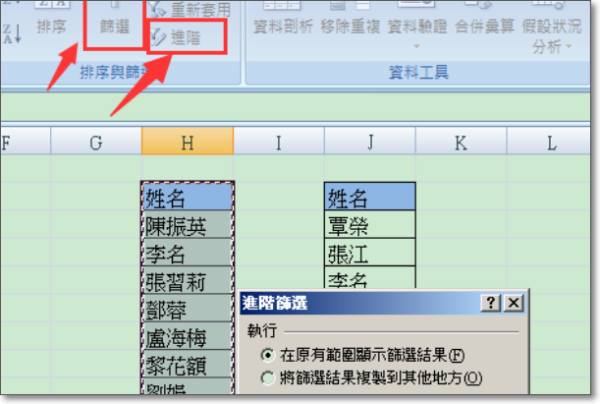 首先选择H列,点击【筛选】—【进阶】,在【进阶筛选对话框】中,【准则范围】选择J列,点击【确定】。