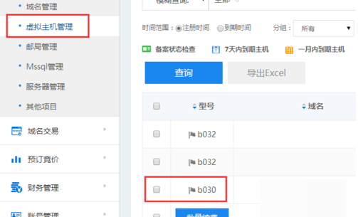 2、然后,然后选择“虚拟主机管理”,再点击忘记密码的程序主机后面的“管理”按钮: