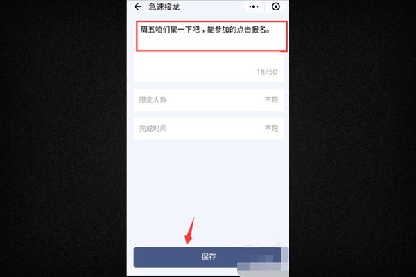 4、然后填入接龙的主题,选择是否限定人数和时间,没有限定可以不填写,填好后选保存。