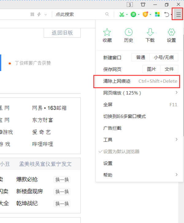 1、以360安全浏览器为例,打开浏览器主页面,点击页面右上角“三”按钮,选择“清除上网痕迹”选项;