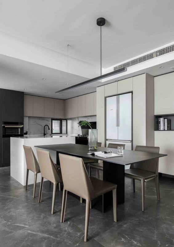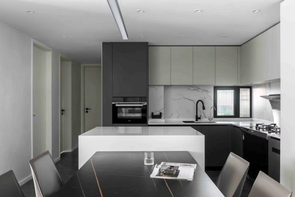现在的户型存在较多的一个问题是,客厅大、厨房餐厅小,导致整体比例有些失调,因此可以考虑餐客厨一体式设计,实现同个空间下的多功能应用。