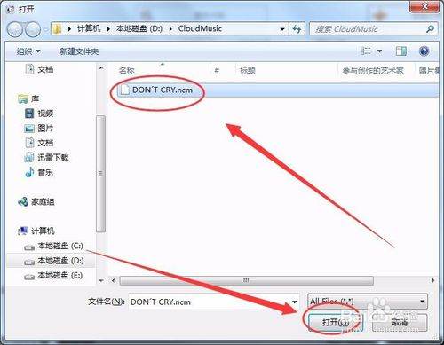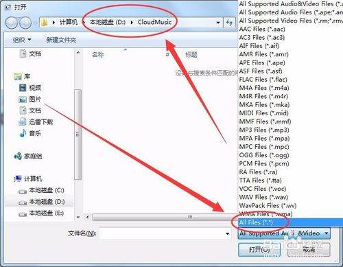 打开ncm格式音乐所在的目录后,选择文件名后的文件格式为All Files。