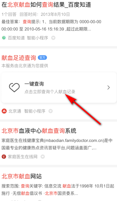 用户可以下载百度APP,搜索北京献血足迹查询,找到献血足迹查询小程序,输入要查询人的相关信息,点击查询就可以了,步骤如下: