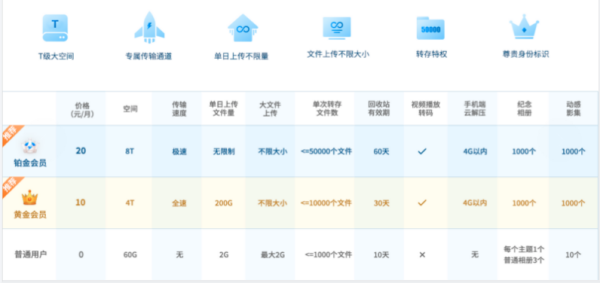 您好,天翼云盘是中国电信面向个人及家庭用户推出的云存储服务产品,定位“个人与家庭的数据中心“,为个人及家庭用户提供手机相册备份、多端文件共享、家庭相册分享、云端视频回看等云存储服务。拥有中国电信专属的传输通道,高清视频上传下载数秒就可以完成,并且拥有超大的存储空间,可以安全存储数百万张高清照片上万部高清视频。天翼云盘普通用户初始空间为60G,可以通过充值会员扩充至 4T、8T,会员分为黄金会员和铂金会员两个等级。
