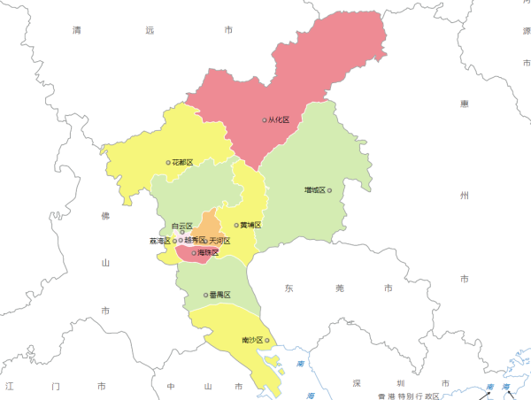 从化区,隶属广州市,位于广东省广州市东北面,东与龙门县、增城区接壤,南跟白云区毗邻,西和清远市、花都区交界,北面同佛冈、新丰县相连。