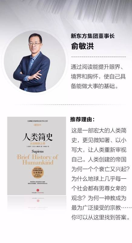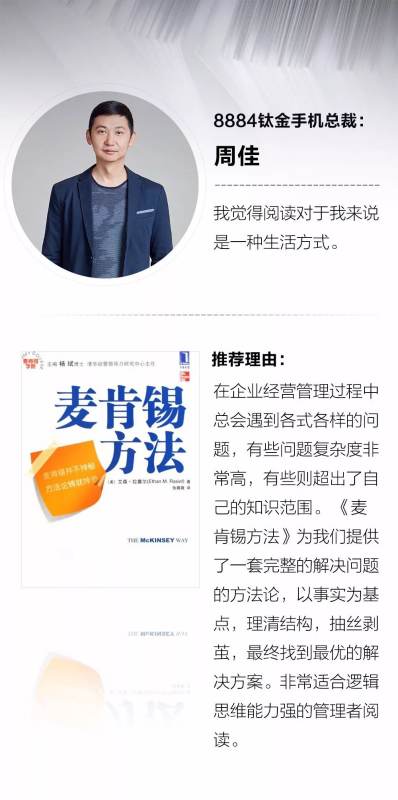 因此,8848钛金手机携手当代优秀企业家,为大家分享好书和人生经验,传递企业家精神,践行“全民阅读”。继第一批总裁书单曝光后,俞敏洪、孙振耀、夏华、姜俊贤、韩国辉、周佳六位企业家,也以8848领读者的身份,为大家推荐书目,以带动更多人加入读书中来。