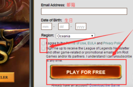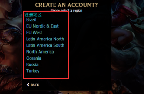 注册LOL美服测试服账号先打开浏览器搜索LOL美服,点LOGIN的选项进入登录界面,选择注册地区,填写账号、密码/邮箱等即可。具体如下: