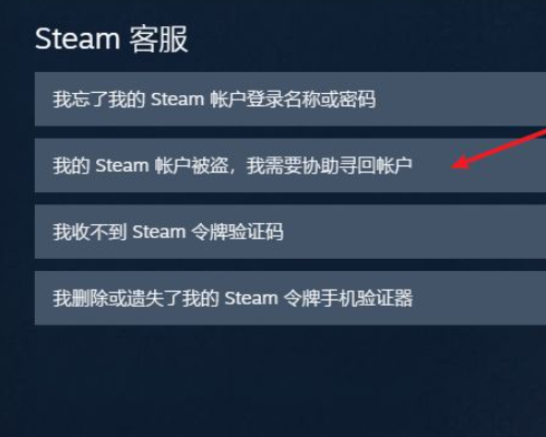 2、随后打开steam客服页面,这里点击我steam账号被盗,需要协助寻回账户选项。