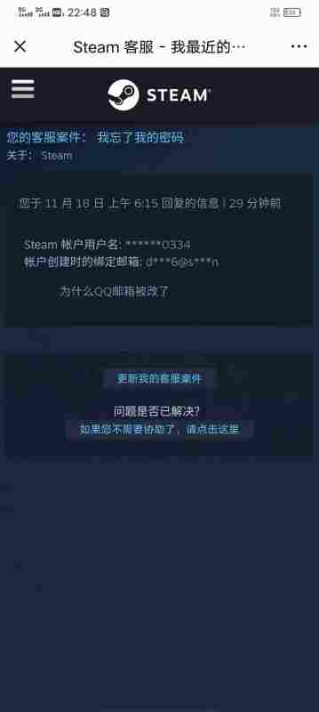 当steam被盗,绑定的邮箱、手机号又被更改时,首先点击登录界面的“我无法登录”按钮。然后在弹出来的页面中选择“我的steam账号被盗,我需要协助寻回账户”在“寻回我的账号”内点击“更改我的密码”然后输入“steam用户名”,点击“确定”然后选择【我不再能使用此电子邮件地址】之后点击“我忘了我的密码”在弹出的申诉界面中输入第一次注册的邮箱(哪怕是原来邮箱被改了也可以)及其他信息上传后台,再等待几个工作日就可以登录了。望采纳steam密码被修改了,购买在里面的游戏是不是也不可以用了? 还是可以重新创建新的账号把游戏载入