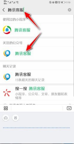 2、然后输入“腾讯客服”选择红色箭头所指的,如下图所示: