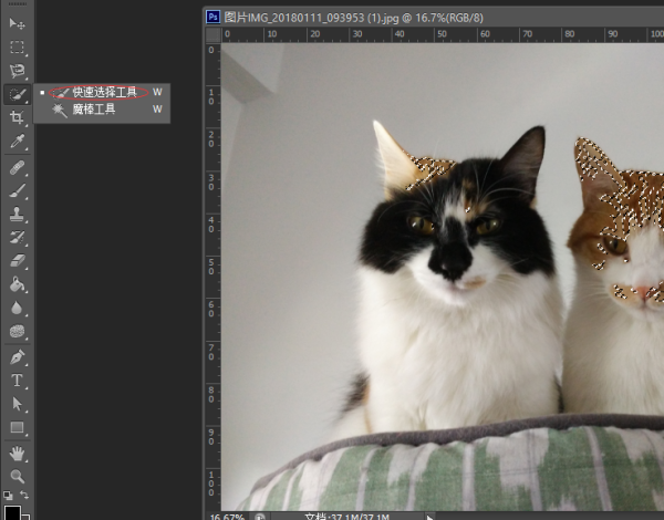 4、魔棒工具点击完后效果如下图,接着选择快速选择工具,把黄猫头抠出来。