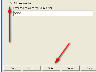 3、选择Add sorce file,让工程自动帮生成一个程序文件,写上.C文件名称。点击Finish。