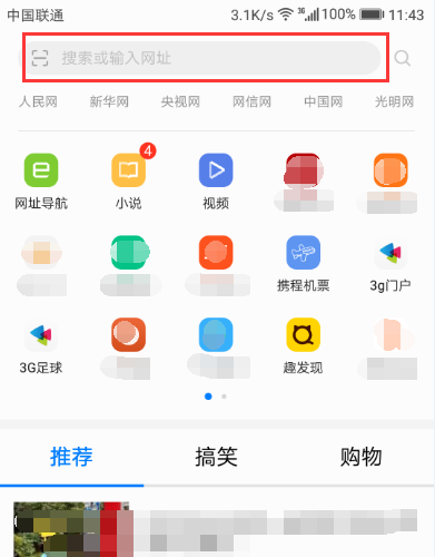 三、打开手机浏览器后,点击顶部的“搜索或输入网址”栏。