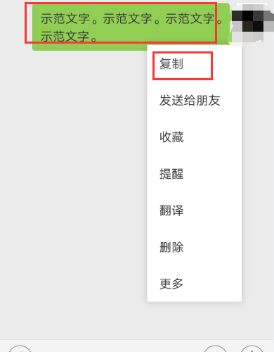 一、首先在任意一个好友里面找一条信息,手指长按文字,弹出的选项内点击“复制”。