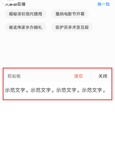 五、点击剪贴板后,在这里就能够看到刚才所复制的文字了。手机的剪贴板一般都是由默认输入法提供,但在微信中输入法的顶部不会显示出来“剪贴板”,所以可以在浏览器或是别的能够输入文字的地方用此步骤找出复制过的文字。