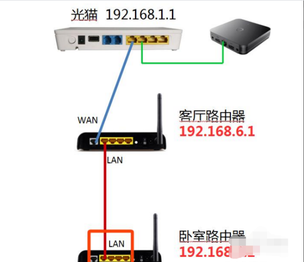 连接方式:副路由器的WAN端口连接到主路由器的LAN端口,副路由器作为二级路由使用,主路由器所连接的终端和副路由器连接的终端属于不同的网段;