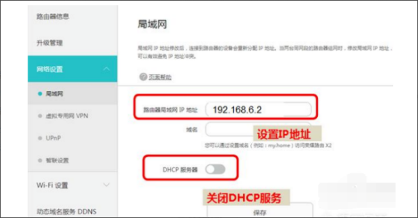 step2:配置副路由器的管理IP地址与主路由器一个网段,方便对副路由器进行管理,如果主路由器为192.168.6.1,那么副路由器可以设置为192.168.6.2等;