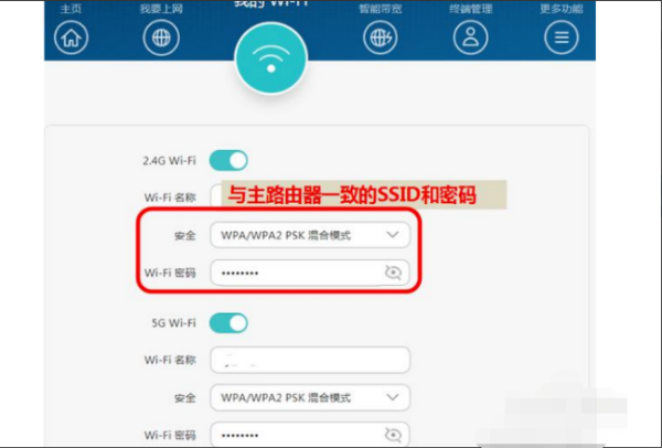 step4:配置副路由器SSID和密码与主路由器一致,有些手机可以根据无线信号的强度自动切换无线信号,实现某种程度的“无线漫游”。