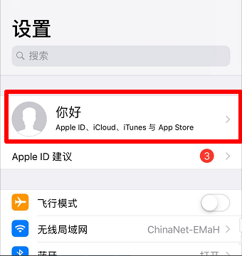 4、也可以在进入“设置”后,点击"Apple ID"帐户,如下图所示:
