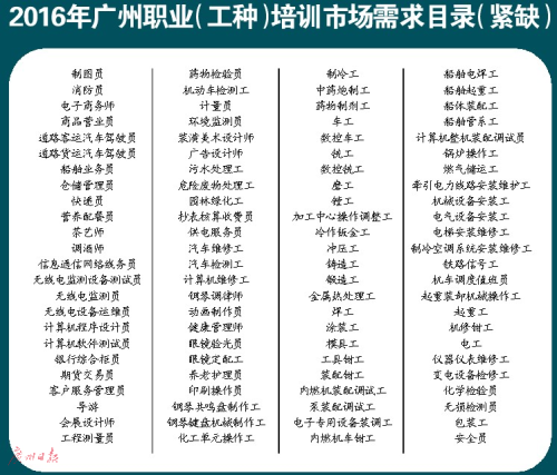 广州日报讯(记者何颖思)昨日,广州市人社局发布2016年广州职业(工种)培训市场需求目录(紧缺),共涉及焊工、冲压工、制图工等96个工种,有部