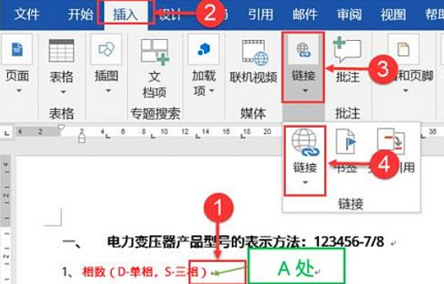 将光标定位至A处,点击【插入】选项卡,【链接】组中的【链接】按钮,打开【插入超链接】对话框。在打开的【超链接】对话框中,点击【本文档中的位置】按钮,在右侧列表中,选择【书签】选项下的书签名【目标位置】,点击【确定】按钮,完成超链接的设置。