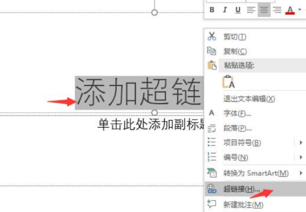 2、然后选中需要添加超级链接的文字,点击右键会看到超链接选项。