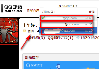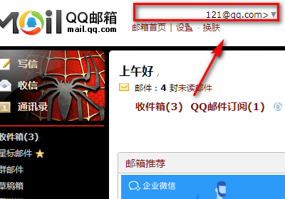4、然后,完成上述步骤后,找到QQ邮箱LOGO旁边的电子邮件地址,单击后面的倒三角形图标,如下图所示,然后进入下一步。