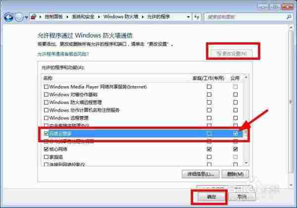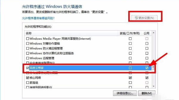 点击“允许应用通过Windows防火墙”,点选“更改设置”。