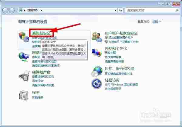 首先打开控制面板,进入“系统和安全”。