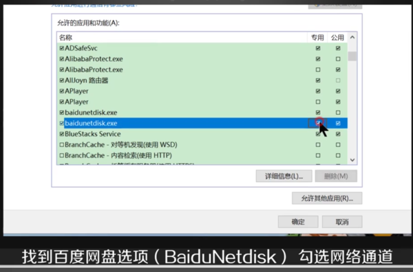 找到“百度网盘”选项(BaiduNetdisk),勾选“网络通道”。