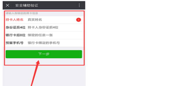 接下来输入自己的真实姓名、身份证后4位、银行卡后8位、手机号等信息,一定要真实,填写完毕,点击“下一步”。