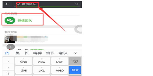 短信发送后,微信中搜索“微信团队”,点击进入