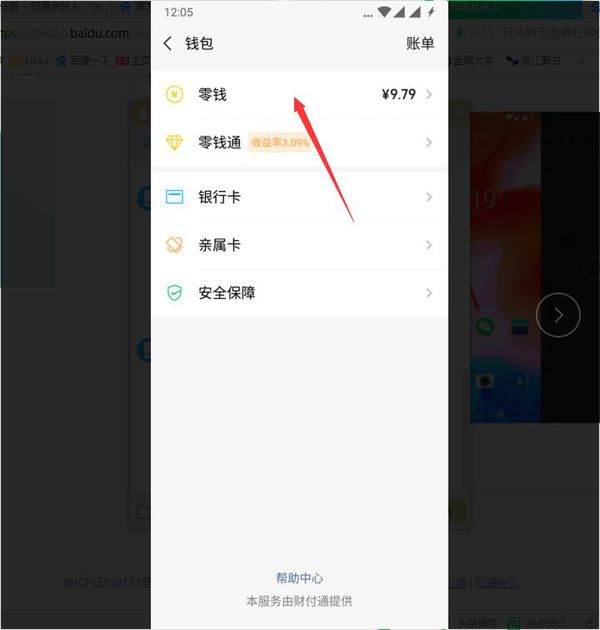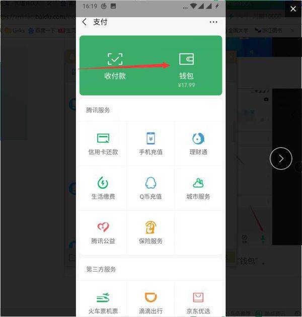3、然后在支付页面中,选择箭头所指处的“钱包”,点击进入。