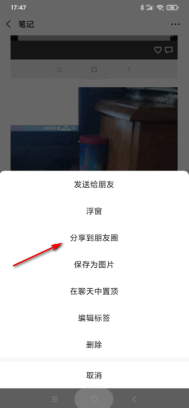 4、最后点击保存好的笔记,进入到笔记之后往下拉就可以看到视频和图片在一起了,点击右上角的三个点的图标后选择“分享到朋友圈”就可以了。