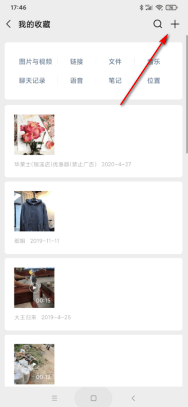 3、打开收藏页面后,点击右上角的+号,如图所示。