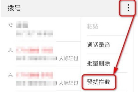 2、然后在弹出来的窗口中点击打开右上角三个点中的“骚扰拦截”。