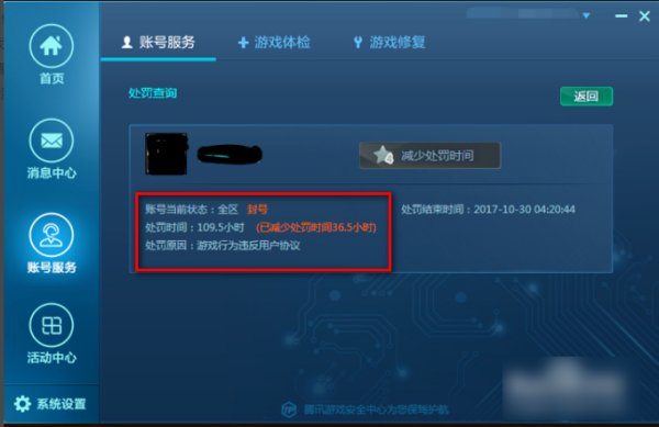 2、然后在打开的界面中可以看到自己哪一个游戏被封号了,找到那个游戏,点击减少处罚时间。