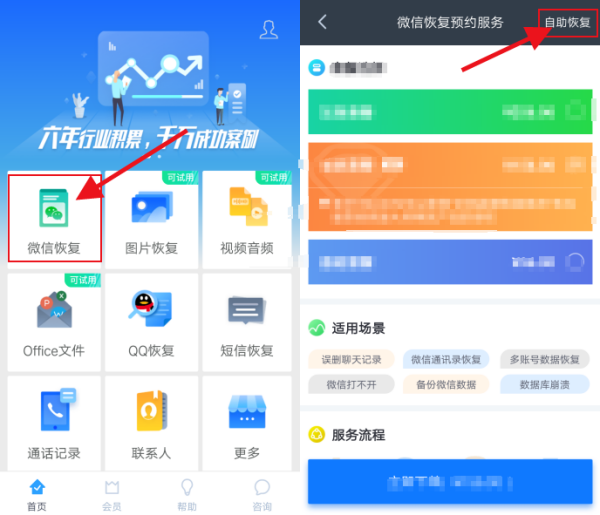 打开软件主界面之后,在首页我们可以看到八大恢复类型,我们需要恢复的是手机微信信息,点击微信恢复即可。接下来,跳转到下一个界面,我们点击右上角的【自助恢复】按钮。