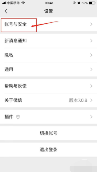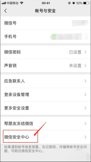 3、进入到“帐号与安全”页面后,选择下方的“微信安全中心”进入。如图所示: