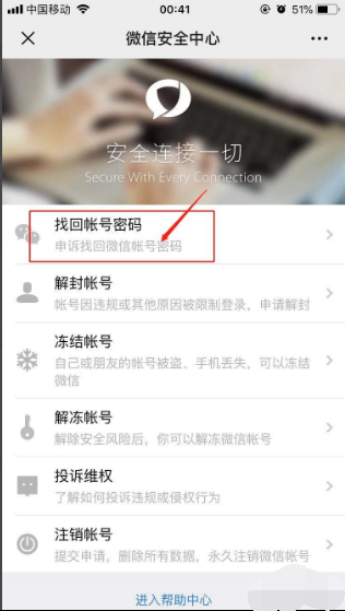 4、进入到微信安全中心,选择“找回帐号密码”,申诉找回微信帐号密码,如图所示:
